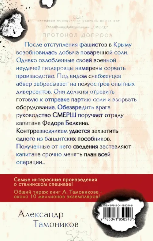 После отступления фашистов в Крыму возобновилась добыча поваренной соли. Однако озлобленные своей военной неудачей гитлеровцы намерены сорвать производство. Под видом снабженцев абвер забрасывает на полуостров опытных диверсантов. Они должны отравить готовую к отправке партию соли и взорвать оборудование. Обезвредить врага руководство СМЕРШа поручает отряду капитана Федора Белкина. Контрразведчикам удается захватить одного из бандитских пособников. Полученные от него сведения заставляют капитана срочно менять план всей операции…