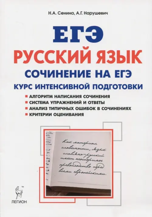 Учебно-методическое пособие Н. А. Сениной и А. Г. Нарушевича "Русский язык. Сочинение на ЕГЭ. Курс интенсивной подготовки" предназначено для тех, кто хочет научиться писать сочинение и получить максимальный балл на экзамене. Оно содержит систематизированные теоретические сведения о структуре и компонентах сочинения-рассуждения, а также разработанные авторами задания и методику подготовки к выполнению части 2. Отличительной особенностью книги является большое количество схем и таблиц, что способствует оптимальному восприятию и запоминанию материала. В пособие включено также много разнообразных и оригинальных упражнений, часть которых дана в тестовой форме и снабжена ответами. Таким образом, формат книги позволяет использовать её как тренировочную тетрадь. Книга "Русский язык. Сочинение на ЕГЭ. Курс интенсивной подготовки" входит в комплекс пособий под редакцией Н. А. Сениной по русскому языку для подготовки к ЕГЭ, хотя по своему содержанию является совершенно автономной. Пособие адресовано учителям и выпускникам школ, однако по нему можно начинать готовиться к сочинению уже в 10-х классах.