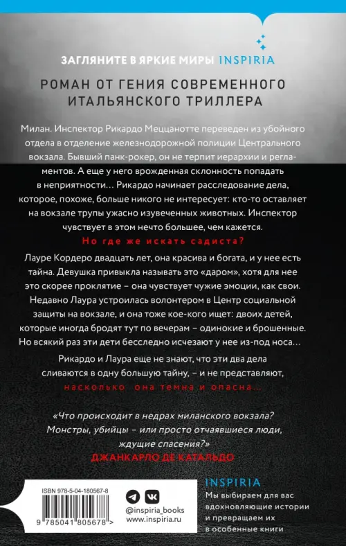 Милан. Инспектор Рикардо Меццанотте переведен из убойного отдела в отделение железнодорожной полиции Центрального вокзала. Бывший панк-рокер, он не терпит иерархии и регламентов. А еще у него врожденная склонность попадать в неприятности… Рикардо начинает расследование дела, которое, похоже, больше никого не интересует: кто-то оставляет на вокзале трупы ужасно изувеченных животных. Инспектор чувствует в этом нечто большее, чем кажется. Но где же искать садиста?