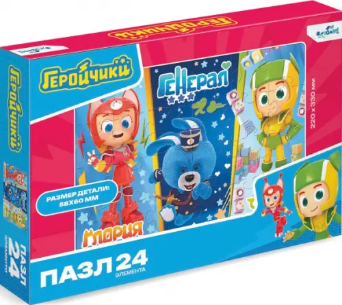 Пазл 24 элемента с забавными героями мультфильма Геройчики обязательно понравится малышу, а сборка яркой картинки принесет радость не только детям, но и их родителям. Крупные детали пазла удобно ложатся даже в самую маленькую ручку и их комфортно собирать на полу.
