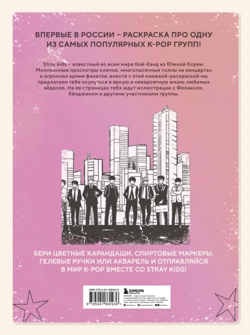 Впервые в России - раскраска по одной из самых известных k-pop групп 21 века! На ее страницах мы собрали иллюстрации с участниками популярного корейского бой-бэнда Stray Kids: фанаты смогут раскрасить изображения как каждого участика в отдельности, так и всех участников группы вместе. Плотная офсетная белая бумага позволит рисовать как цветными карандашами и гелевыми ручками, так и спиртовыми маркерами и даже красками, и украшать стены своей спальни яркими рисунками.