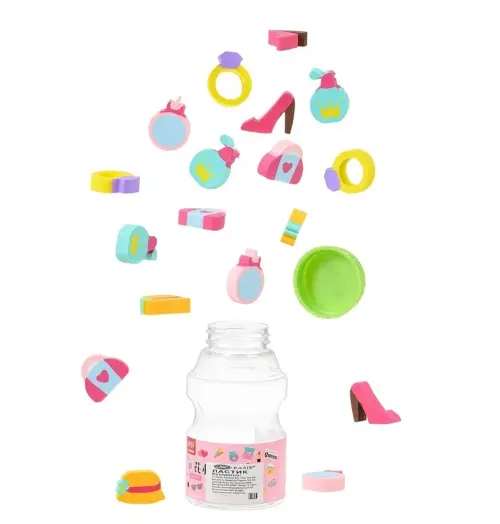 Ластик выполнен в форме сумочки, колечка, шляпки и т.д. /ассорти/, в пластиковой баночке /9*5 см/ по 18 шт /2,5*2 см/.