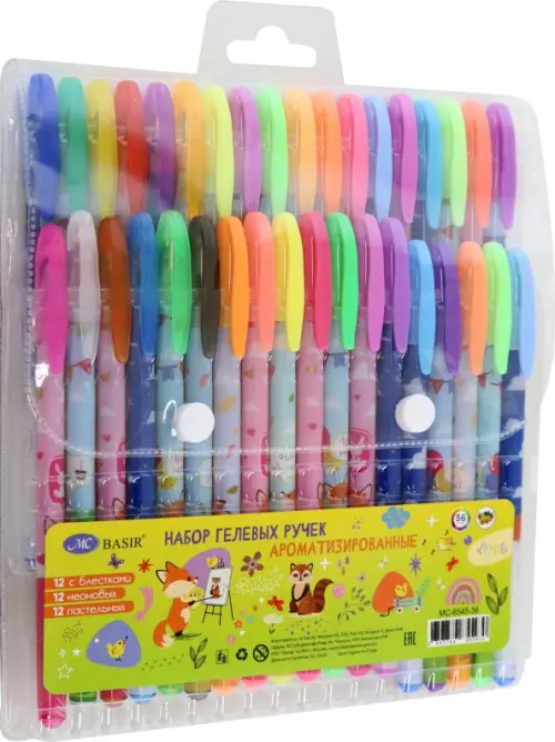 Набор гелевых ручек: ароматизированные, 12 с блёстками, 12 пастельных, 12 неоновых, цветной пластиковый корпус с рисунком, цветной колпачок /в цвет чернил/, упаковка с европодвесом, 36 цветов.