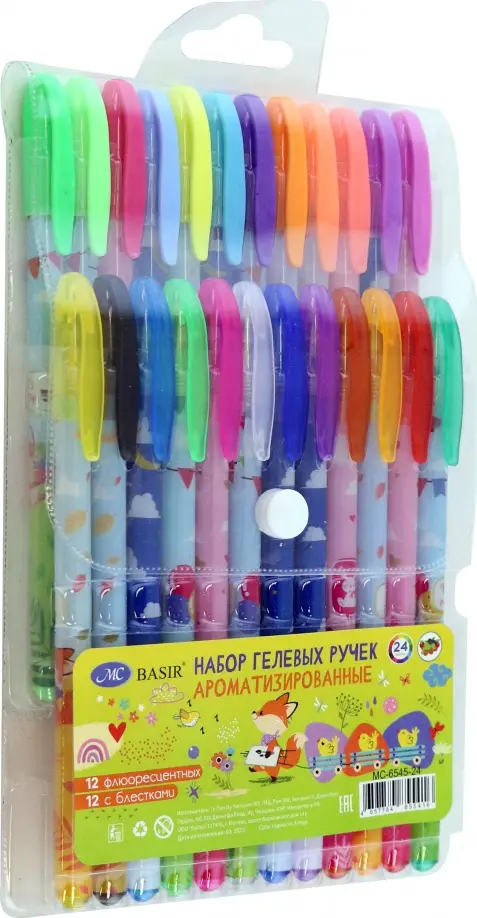 Набор гелевых ручек: ароматизированные, 12 с блёстками, 12 флуоресцентных, цветной пластиковый корпус с рисунком, цветной колпачок /в цвет чернил/, упаковка с европодвесом, 24 цвета.