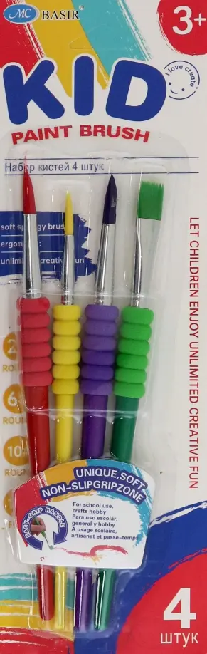 Набор кистей: состоит из 4 художественных кистей ( плоские, круглые №2,6,12,10), изготовленных из нейлона, цветные, с фигурным мягким держателем для пальцев.