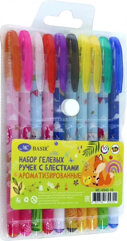 Набор гелевых ручек: ароматизированные, с блёстками, цветной пластиковый корпус с рисунком, цветной колпачок /в цвет чернил/, упаковка с европодвесом, 10 цветов.
