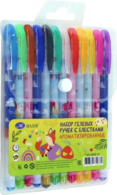 Набор гелевых ручек: ароматизированные, с блёстками, цветной пластиковый корпус с рисунком, цветной колпачок /в цвет чернил/, упаковка с европодвесом, 12 цветов.