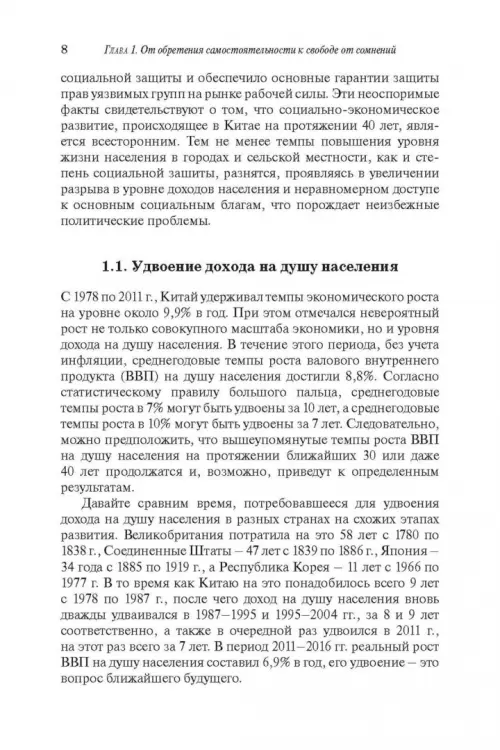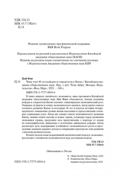 В книге видного китайского экономиста, вице-президента Китайской академии общественных наук Цай Фана объясняется, почему политика реформ и открытости Китая успешно стимулировала экономический рост. Опираясь на факты и логику экономического анализа, автор кратко описал успешное развитие Китая за последние 40 лет и показал историю беспрецедентного повышения уровня жизни населения и предоставления основных социальных услуг. Автор дал оценку этапов экономического развития Китая, выявил новые вызовы и новые задачи, встающие перед развитием экономики страны, предложил свое представление о переходе от опоры на демографические дивиденды к получению дивидендов реформ. Автор рассмотрел путь поддержания устойчивого экономического роста и преодоления ловушки среднего дохода и совершения перехода на этап развития с высоким уровнем дохода.