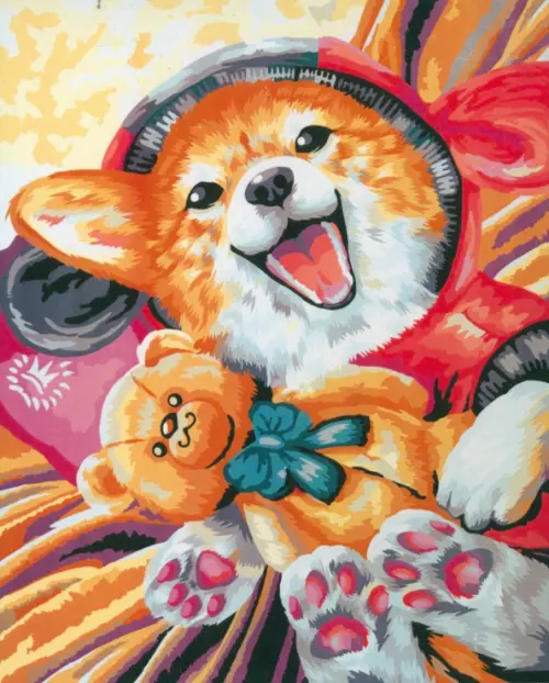 Картина по номерам на холсте 40х50 см «Корги с игрушкой» понравится и детям, и взрослым.