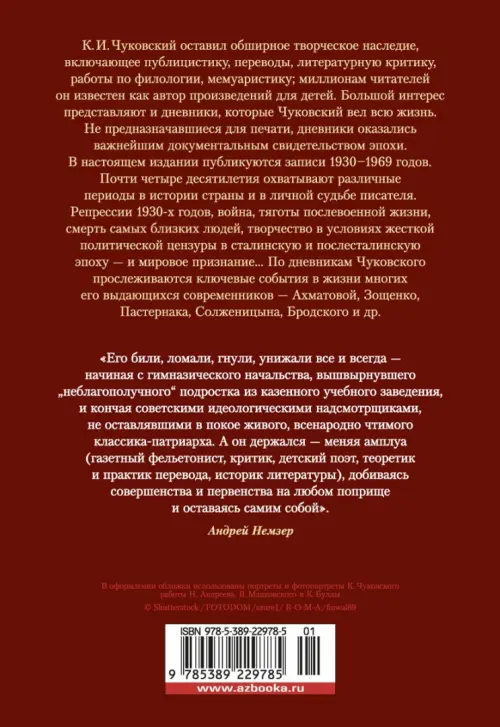 К. И. Чуковский оставил обширное творческое наследие, включающее публицистику, переводы, литературную критику, работы по филологии, мемуаристику; миллионам читателей он известен как автор произведений для детей. Большой интерес представляют и дневники, которые Чуковский вел всю жизнь. В настоящем издании публикуются записи 1930–1969 годов. Почти четыре десятилетия охватывают различные периоды в истории страны и в личной судьбе писателя. Репрессии 1930-х годов, война, тяготы послевоенной жизни, смерть самых близких людей, творчество в условиях жесткой политической цензуры в сталинскую и послесталинскую эпоху — и мировое признание... По дневникам Чуковского прослеживаются ключевые события в жизни многих его выдающихся современников — Ахматовой, Зощенко, Пастернака, Солженицына, Бродского и др.
