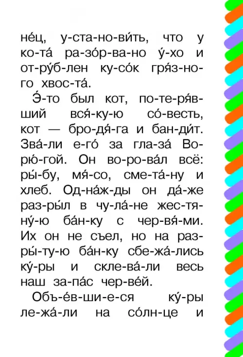 Ваш малыш уже знает буквы и его ручки тянутся к книжкам? Покажите ему серию «Сам читаю по слогам». Это книжки небольшого формата, с большими буквами, и все слова разбиты на слоги с ударениями. В этой серии собраны лучшие произведения классиков детской литературы — С. Маршака, С. Михалкова, Э. Успенского, Г. Остера, В. Сутеева и других знаменитых писателей и поэтов. Каждую книгу маленькие мальчики и девочки смогут прочитать сами от начала и до конца. А потом будут гордо говорить: «Вот мои первые прочитанные книжки. Хочу читать ещё!». В этой книге малыши прочитают весёлую историю