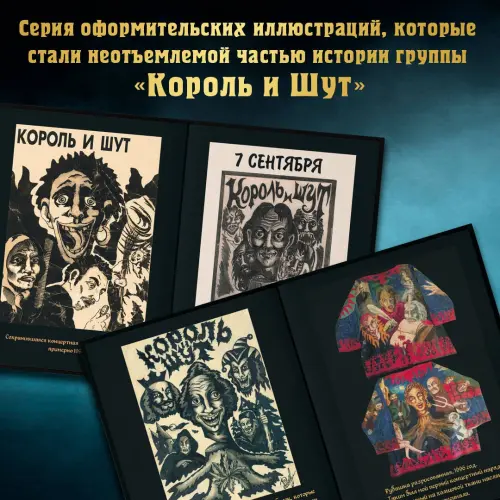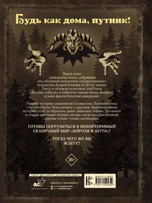 Перед вами уникальная книга, собравшая под обложкой результаты художественного творчества Андрея Князева за 50 лет жизни. Здесь и обложки культовых альбомов «Короля и Шута», и наброски героев песен, комиксы и даже фантастические декорации. Узнайте историю знаменитой Головы-пня. Познакомьтесь с Крокозябром, Попугаеедом и другими. Выясните, какие истории стоят за образами давно знакомых героев. Загляните в старые школьные тетради автора, когда история великой группы только-только начиналась.