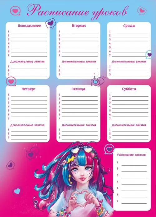 При выборе расписания уроков для меня важно было наличие разлиновки под расписание звонков. Наткнулась на серию "Романтичная девушка", в частности в этой серии нашлось такое расписание. Заказала. Заказ доставили с задержкой, не значительной. Расписание было свернуто в рулон, нигде ничего не замялось. Понравилось качество, хороший мелованн...