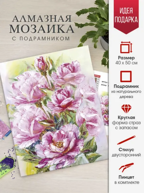 Набор для творчества Алмазная мозаика, размер: 40*50 см, (25 цветов страз, холст на подрамнике с напечатенной картиной, покрытый клеевым слоем и защитной пленкой, пакеты со стразами, лоток для страз, стилус, силикон для страз, клей, пинцет металлический, подвесы для подрамника, схема, дополнительные пакеты с zip-молнией в комплекте, форма страз: круглая, тип выкладки: полная, картонная коробка с ручкой)