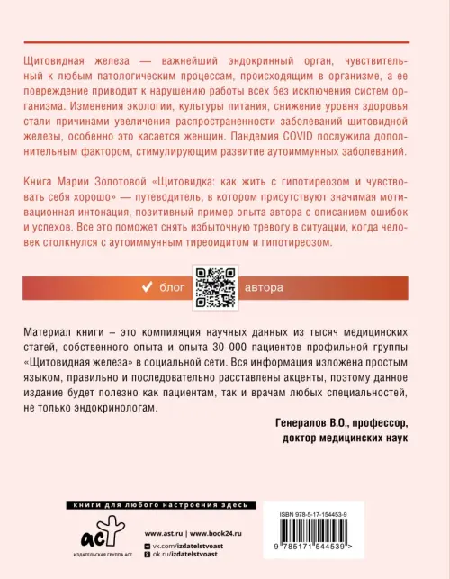 Книга Марии Золотовой “Щитовидка: как жить с гипотиреозом и чувствовать себя хорошо” - путеводитель, в котором присутствуют значимая мотивационная интонация, позитивный пример опыта автора с описанием ошибок и успехов. Все это поможет снять избыточную тревогу в ситуации, когда человек столкнулся с аутоиммунным тиреоидитом и гипотиреозом.