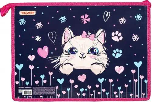Папка для тетрадей ПИФАГОР формата А4 выполнена из ламинированного картона и пластика, по краям имеет тканевую окантовку. Одно отделение. Застежка-молния расположена по верхнему краю папки. Цветная печать.
