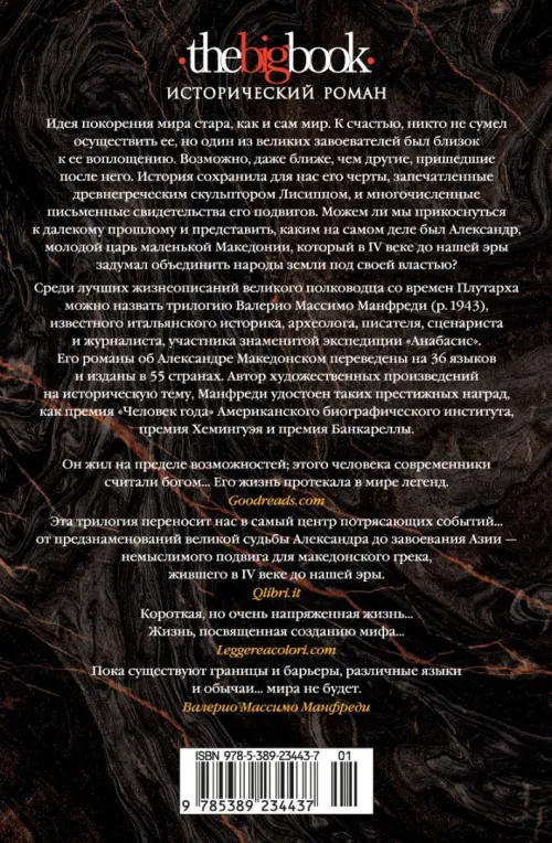 Идея покорения мира стара, как и сам мир. К счастью, никто не сумел осуществить ее, но один из великих завоевателей был близок к ее воплощению. Возможно, даже ближе, чем другие, пришедшие после него. История сохранила для нас его черты, запечатленные древнегреческим скульптором Лисиппом, и письменные свидетельства его подвигов. Можем ли мы прикоснуться к далекому прошлому и представить, каким на самом деле был Александр, молодой царь маленькой Македонии, который в IV веке до нашей эры задумал объединить народы земли под своей властью? Среди лучших жизнеописаний великого полководца со времен Плутарха можно назвать трилогию Валерио Массимо Манфреди (р. 1943), известного итальянского историка, археолога, писателя, сценариста и журналиста, участника знаменитой экспедиции «Анабасис». Его романы об Александре Македонском переведены на 36 языков и изданы в 55 странах. Автор художественных произведений на историческую тему, Манфреди удостоен таких престижных наград, как премия «Человек года» Американского биографического института, премия Хемингуэя и премия Банкареллы.