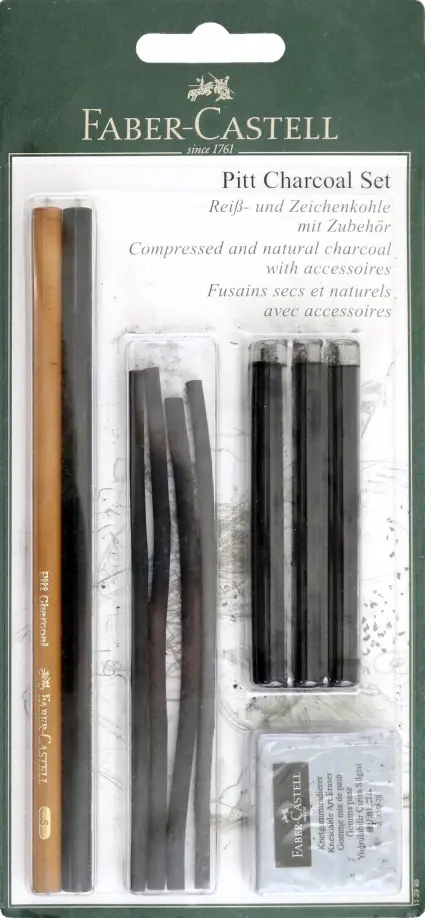 Уголь-карандаши (2 шт), прессованный уголь (3 шт), натуральный уголь (4 шт), ластик (1 шт)