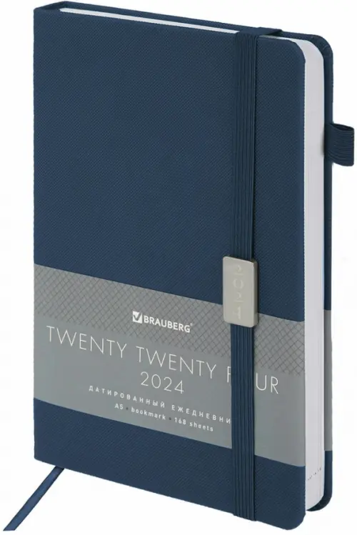 Внутренний блок включает 168 листов белой бумаги плотностью 70 г/м2. Каждая страничка имеет перфорированный угол. Благодаря стандартному формату А5 (138х213 мм) ежедневник удобно использовать как в офисе, так и на выездных деловых встречах. Жесткая книжная обложка благородного синего цвета стилизована под искусственную кожу с мелким рисунком, фиксируется резинкой, поэтому ежедневник не откроется в сумке или портфеле и страницы не помнутся. Материал обложки подходит для горячего тиснения. Для удобства пользования ежедневник снабжен держателем для фиксации ручки. Дополнением является закладка-ляссе, с помощью которой при необходимости можно быстро открыть ежедневник на нужной странице. Помимо прочего, ежедневник снабжен обширным справочным материалом.