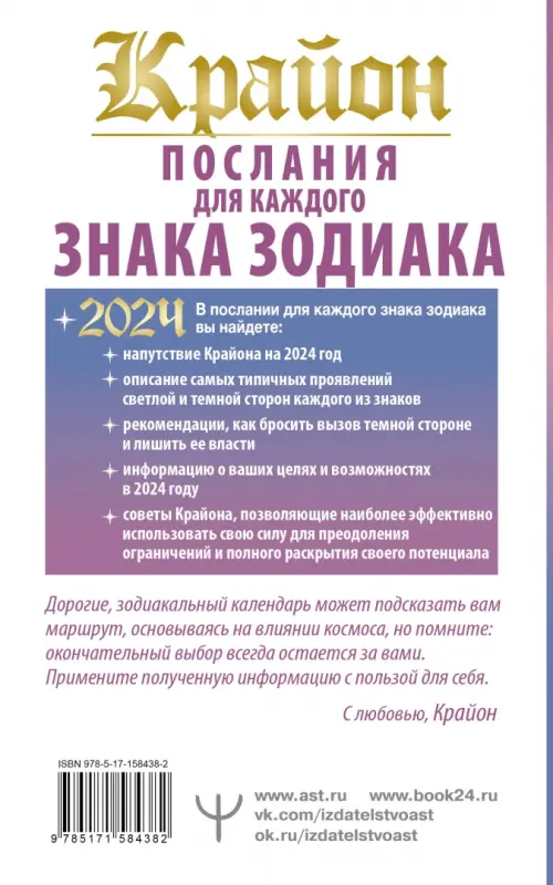 Если вы обнаружили ошибку в описании товара «Крайон Послания для каждого Знака Зодиака на 2024 год» (авторы: Шмидт Тамара), то выделите её мышкой и нажмите Ctrl+Enter. Спасибо, что помогаете нам стать лучше!