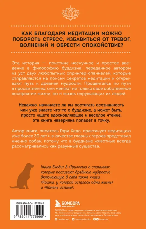 Если вы любите прибегать к медитации, чтобы побороть стресс и обрести спокойствие, то вам будет интересно узнать о буддистских «корнях» этой практики и освоить ее преимущества. Главные герои этой книги — два спрингер-спаниеля, которые постигают древнюю мудрость. Основы теории буддизма автор объясняет максимально доступно благодаря тому, что описывает их с точки зрения собак. Cпрингер-спаниель и ее сводная сестра решили выяснить, почему их владелец медитирует и интересуется учением Будды. При помощи источника знаний — книжного шкафа — они отправляются на поиски секретов медитации. Текст написан легко, понятно и даже с юмором.