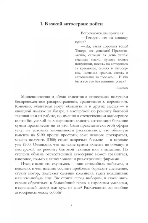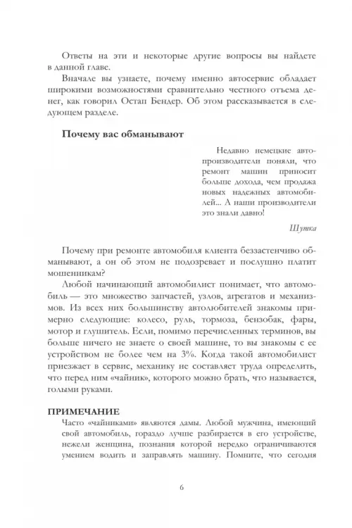 Основная причина — это неприкрытое рвачество, наглость и откровенное мошенничество некоторых работников автосервиса. Нет, автор ни в коей мере не уговаривает автомобилистов сию же секунду бросить все и отправляться на поиски «народных умельцев», навсегда отказавшись от посещений официально действующих СТО (тем более что и среди «гаражных мастеров» жуликов тоже хватает). Изучение данной книги полезно потому, что в ней простым, понятным и увлекательным языком рассказывается о некоторых наиболее распространенных способах обмана работниками автосервиса доверчивых автомобилистов.