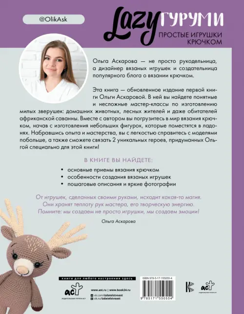 Книга «LAZYгуруми. Простые игрушки крючком. Проект амигуруми» — обновленное издание первой книги Ольги Аскаровой. В ней представлено 18 мастер-классов по изготовлению милых зверушек — домашних животных, лесных жителей и даже обитателей африканской саванны. Вместе с автором вы погрузитесь в мир вязания крючком, начав с изготовления небольших фигурок, которые поместятся в ладонях. Набравшись опыта и мастерства, вы с легкостью справитесь с моделями побольше.