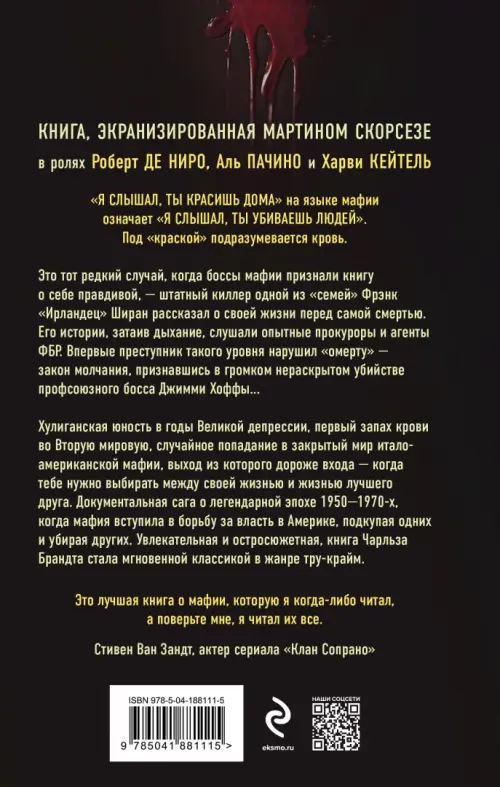 «Я слышал, ты красишь дома» — на языке мафии значит «Я слышал, ты убиваешь людей». Под «краской» подразумевается кровь. Это тот случай, когда боссы мафии признали книгу о себе правдивой, — штатный киллер одной из «семей» Фрэнк «Ирландец» Ширан рассказал о своей жизни перед смертью. Его истории, затаив дыхание, слушали опытные прокуроры и агенты ФБР. Впервые преступник такого уровня нарушил «омерту» — закон молчания.