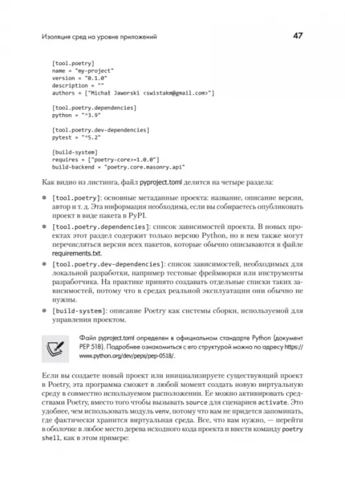 Следующие главы посвящены распространенным паттернам проектирования и методологиям программирования - таким как событийно-ориентированное программирование, параллелизм и метапрограммирование. Также вы разберете сложные примеры кода и будете решать содержательные задачи, связывая Python с C и С++ и создавая расширения, сочетающие сильные стороны разных языков. В заключительных главах рассматривается полный жизненный цикл приложения после ввода в эксплуатацию.