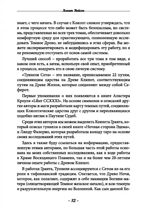 Представляем новую книгу «Туннели Сета», которая является третьим и по следним томом Клипотической Трилогии. Вместе с двумя другими гримуара ми, «Клипотические медитации» и «Клипотическая магия. Эвокации и инвокации», эта серия охватывает все Темное Древо и излагает последовательную и применимую систему подхода к клипот с точки зрения современной магии.