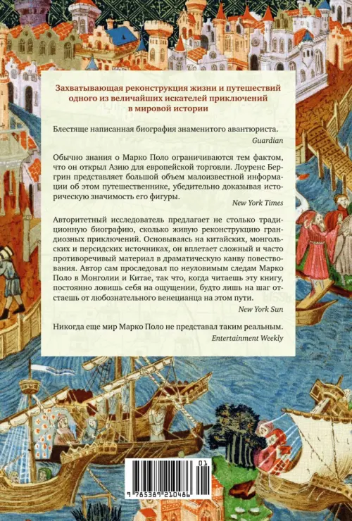 Первоклассный рассказчик, Лоуренс Бергрин создал самое авторитетное на сегодняшний день описание увлекательных путешествий Марко Поло, мастерски соединив жанры научного исследования, биографии и путевого дневника. Невероятная одиссея, вобравшая в себя все фантастические обстоятельства жизни отпрыска богатой купеческой семьи — от юности в Венеции и путешествия в Азию до возвращения в Европу и сочинения книги, история распространения и толкования которой не менее драматична, чем путь ее автора, — предстает в тщательно отобранных и ярких деталях. Опираясь на солидные первоисточники и материалы собственных путешествий по маршруту Поло в Китае и Монголии, Бергрин описывает жизнь человека, расширившего пределы знаний и воображения его современников, и анализирует легенды о нем, отделяя правду от вымысла, а историю от мифа. Книга выдержала множество переизданий, переведена на 14 языков.