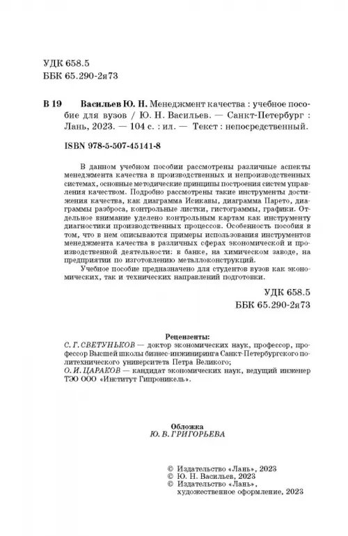 Если вы обнаружили ошибку в описании товара «Менеджмент качества. Учебное пособие для вузов» (авторы: Васильев Юрий Николаевич), то выделите её мышкой и нажмите Ctrl+Enter. Спасибо, что помогаете нам стать лучше!