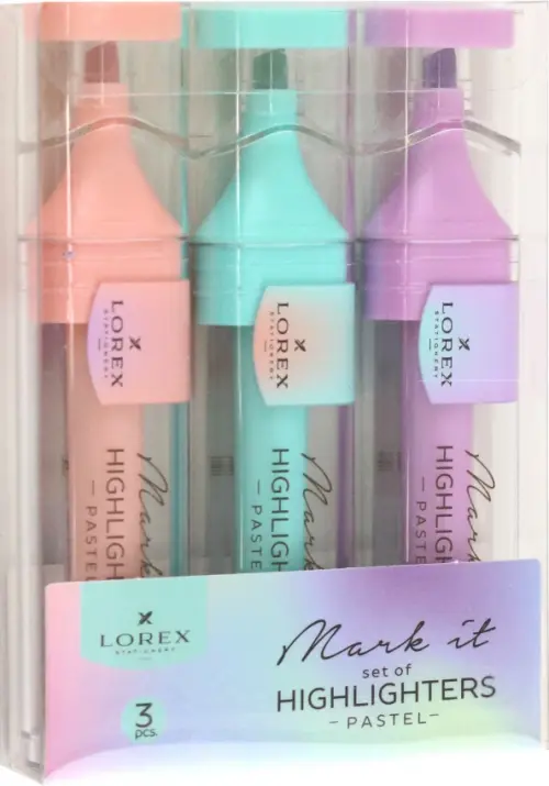 Текстмаркеры LOREX Mark it серии PASTEL – это три нежных пастельных цвета в стильном прозрачном корпусе с нежными акцентами. Цветовая палитра облаков соответствует цвету чернил! Подходят для выделения в тексте, ежедневнике, тетради. Сделают акценты на самые важные моменты. Стержень и колпачок каждого маркера соответствует цвету чернил. Прочный наконечник не западает в корпус и сохраняет форму на протяжении всего срока службы маркера. Скошенный пишущий узел позволяет наносить линии толщиной от 1 до 5 мм.