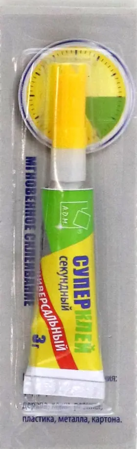 Суперклей выпускается в удобном блистере. Быстро и надежно склеивает металл, кожу, керамику, резину и фарфор.