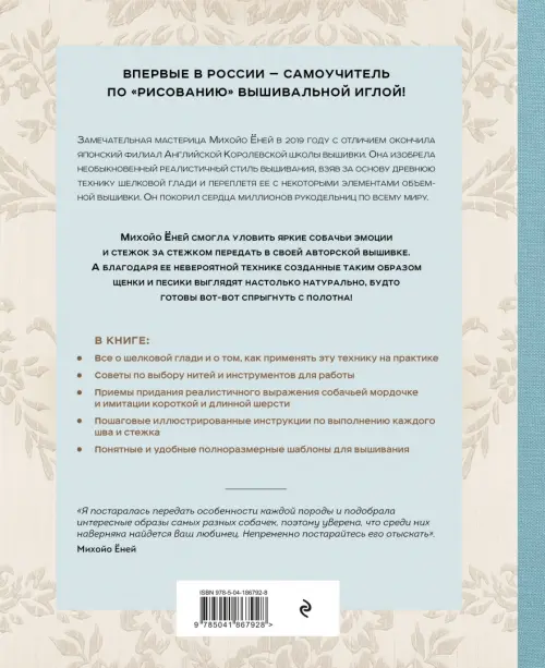 Если вы обнаружили ошибку в описании товара «Портретная вышивка.Самоучитель по «рисованию»собак» (авторы: Ёней Михойо), то выделите её мышкой и нажмите Ctrl+Enter. Спасибо, что помогаете нам стать лучше!