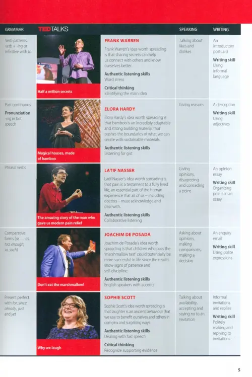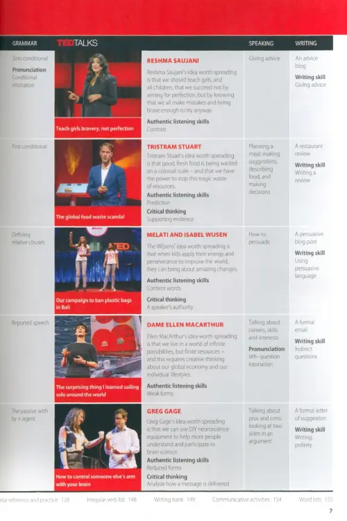 Каждый из 10 модулей учебника предлагает к исследованию с различных сторон одну из глобальным тем, важных для подростков, предоставляя им возможность попрактиковаться в английском языке, выражая собственные идеи и мнение, а просмотр выступлений на TED, подходящих под тематику модуля, поможет ученикам посмотреть на исследуемый вопрос по-новому, развить критическое мышление и выработать стратегии, необходимые для оценки новой информации. Также учебник содержит разделы, направленные на развитие языковых навыков, таких как слушание, чтение, письменная и разговорная речь, понимание грамматики и расширение словарного запаса и задания в форме экзамена, включающие стратегии прохождения, подготавливающие учеников к международным экзаменам.