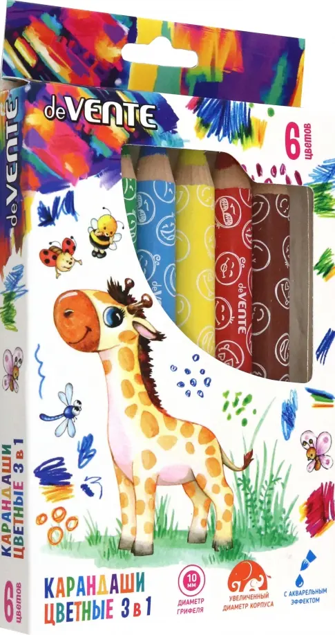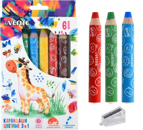 Карандаши цветные "deVENTE. Jumbo 3 in 1" 06 цветов, супер мягкие, с акварельным эффектом, утолщенный деревянный корпус диаметром 14,7 мм, длина корпуса 110мм, диаметр грифеля 10 мм, с точилкой, в картонной коробке
