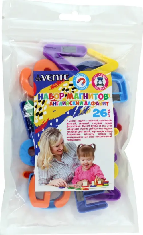 Набор магнитов "deVENTE. Английский алфавит на магнитах" пластиковых, цвета ассорти (7 цветов радуги - красный, оранжевый, желтый, зеленый, голубой, синий, фиолетовый) 26 букв, средний размер буквы 32x28x6 мм, в пластиковом пакете с блистерным подвесом