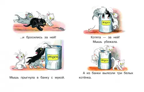 Ох уж эти три котёнка! Куда они только не забирались: побывали и в банке с мукой, и в самоварной трубе, и в пруду. И, конечно, каждый раз меняли цвета своих шубок. А как так получилось и какими котята вернулись домой, вы узнаете из этой книжки!