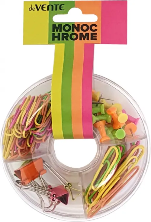 Набор канцелярских принадлежностей "deVENTE. MonoChrome" (скрепки цветные неоновые 50 мм - 15 шт, скрепки цветные неоновые 28 мм - 50 шт, кнопки силовые цветные неоновые - 20 шт, зажимы для бумаг цветные неоновые 19 мм - 4 шт) в пластиковой коробке