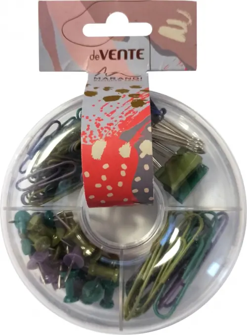 Набор канцелярских принадлежностей "deVENTE. Marandi" (скрепки цветные 50 мм – 12 шт, скрепки цветные 28 мм – 40 шт, кнопки силовые цветные – 30 шт, зажимы для бумаг цветные 19 мм – 4 шт) цвета ассорти (фисташковый, лавандовый, аквамарин) в пластиковой коробке