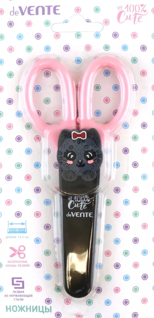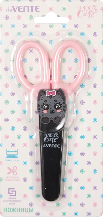 Ножницы детские "deVENTE. 100% Cute. Cat" 13,5 см, пластиковые кольца, защитный футляр с каучуковым декоративным элементом, в картонном блистере