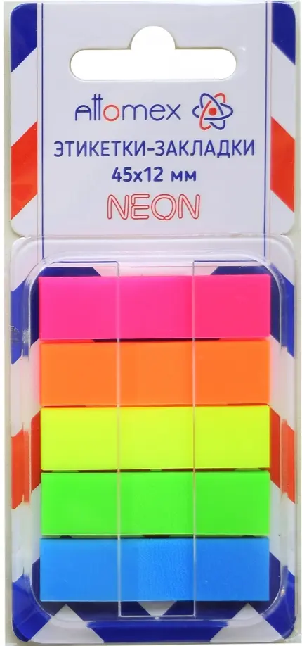 Набор самоклеящихся этикеток-закладок "Attomex" пластиковые полупрозрачные, в диспенсере Z-сложение, 45x12 мм, 5x30 листов, 5 неоновых цветов, в картонном блистере