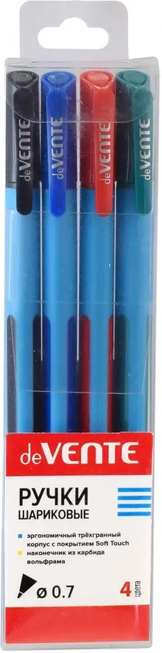 Набор ручек шариковых "deVENTE. Trio Soft" 04 цветов, d=0,7 мм, ультра гладкое письмо, чернила на масляной основе, трехгранный корпус с покрытием Soft Touch, сменный стержень, в пластиковом блистере