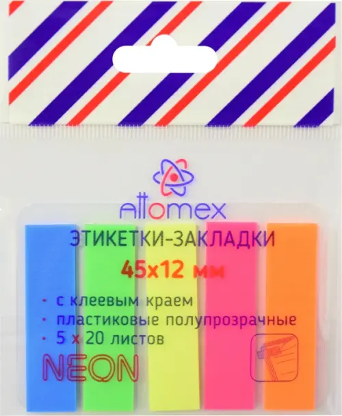Набор самоклеящихся этикеток-закладок "Attomex" пластиковые полупрозрачные 45x12 мм, 5x20 листов, 5 неоновых цветов, в пластиковом пакете с европодвесом