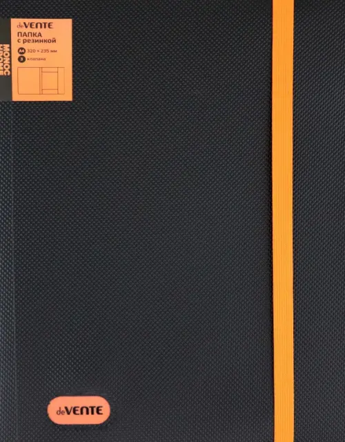 Папка с резинкой "deVENTE. MonoChrome" A4 (245x320 мм) 500 мкм, с рельефной фактурной поверхностью, вертикальная неоновая оранжевая резинка 15 мм, 3 клапана, индивидуальная маркировка, непрозрачная черная с неновым оранжевым