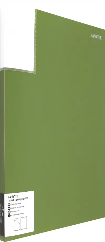 Папка с 020 вкладышами A4 "deVENTE. Marandi" A4 (235x310x15 мм) 500 мкм, фактура "песок" вкладыши 30 мкм, с внутренним карманом A4 160 мкм, индивидуальная упаковка, непрозрачная фисташковая