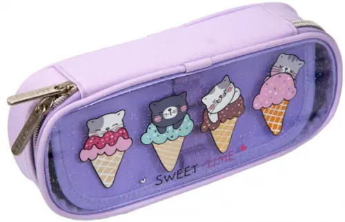 Пенал "deVENTE. Ice catte" 22x9x5 см, овальный, с внутренним органайзером-створкой на липучке, текстильный с верхней крышкой из тонированного полупрозрачного ПВХ с блестками