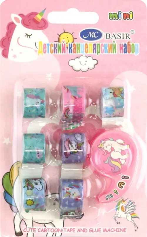 Набор подарочный канцелярский: детский "ЕДИНОРОГ"; декоративный скотч 7 штук+диспенсер, пластиковая упаковка на подложке /13,5*8 см/.