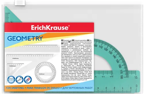 Набор геометрический непрозрачный из высококачественного пластика. В комплекте 3 предмета: линейка с двусторонней шкалой 15см, угольник 45°/7см, транспортир 180°/10см.